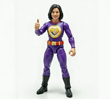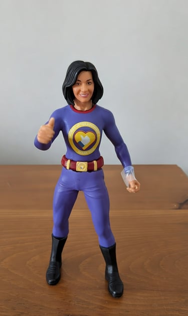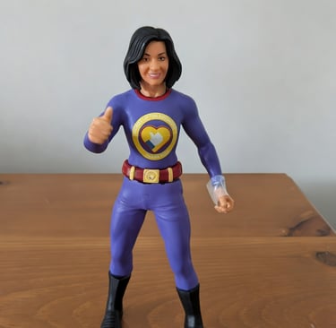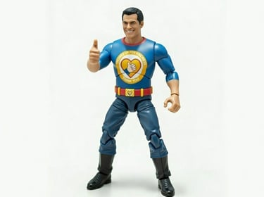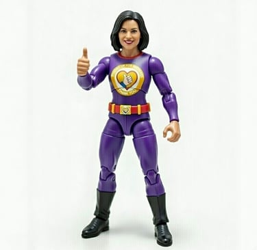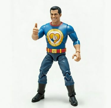 We developed HeroKindness from a paper image to a computer and into a 3D figure. We had a 3D printed version created to test the shape, size of 6 inches, facial expression of a warm smile, the thumbs up pose and logo visibility.